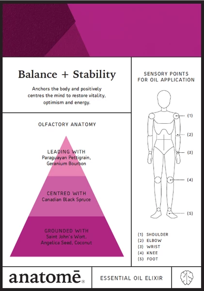 Description Balance + Stability Oil is a spicy, earthy and grounding scent that stimulates the brain and body to bring a sense of calm. A terpene-rich blend with naturally found compounds that are clinically proven to reduce stress and manage anxiety, the complex blend of 25 essential oils grounds and restores optimism by using Patchouli, Petitgrain and Geranium. The centre notes of Black Spruce and Sandalwood improve breathing and bring relaxation. The base notes of St John’s Wort and Angelica Seed uplift the mind, promoting emotional balance. When to use Balance + Stability? Add a few drops to the skin and take a quick break to help restore vitality, optimism and energy throughout your day. Ingredients Petitgrain Paraguay: Wild orange possesses reviving qualities, dispelling tension and encouraging positivity. The zesty aroma is energising and uplifting to any atmosphere while the impact it has on the heart and mind is among its most popular qualities. Geranium Bourbon: boosts emotional wellness, geranium oil balances the mind and acts as a tonic to the nervous system. Tunisian Neroli: emotionally soothing, instils a feeling of space. Cajeput: clears thought, awakens and aids the body, complements your detox routine. Sandalwood: a relaxing oil that brings a sense of peacefulness or peace of mind of mind. This oil is perfect for promoting quiet contemplation and meditation. Angelica Seed Oil: relieves every day stresses and promotes a contemplative sense of calm and balance. St John’s Wort: known for its complex, uplifting properties. Essential Oil Composition Leading with: Paraguayan Black Pepper, Geranium Bourbon Centred with: Canadian Black Spruce, Sandalwood, Neroli Grounded with: St John’s Wort, Angelica Seed Carrier Oil: Coconut Oil Direction of use Apply topically to any of the recommended exterior sensory points on the body, when feeling anxious, stressed, emotionally challenged to centre the mind and balance the body. Breath (inhale and exhale) deeply and slowly 5 times. anatomē recommended Sensory Point Application: Shoulders, elbows, wrists, knees and feet. Diffuser: Apply 2 to 5 drops in a diffuser to feel grounded. Bath: 4 to 6 drops of the oil. Relax for 30 minutes.