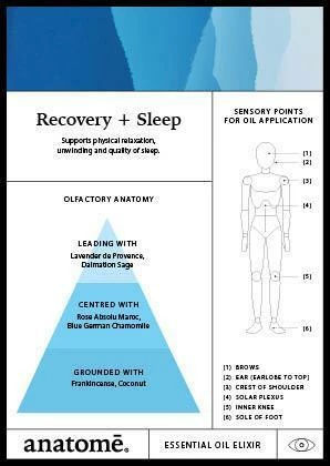 Description Need deeper, longer sleep? Deeper sleep? This rich blend of x22 essential oils promotes relaxation with natural sedative and restorative properties to support seven hours of unbroken sleep using a signature note of Japanese Seaweed that supports a deeper sleep. At anatomē we focus on the provenance and quality of the ingredients, searching the world for the finest, best performing plant extracts to support your sleep. This rich blend of x22 essential oils that include 3 types of Lavender, Somalian Frankincense, Seaweed and Chamomile supports relaxation with natural sedative and restorative properties to support seven hours of unbroken sleep. Applied externally to pulse points the blend of essential oils combine to train and support your brain and body to sleep. How does Recovery + Sleep essential oil work? Focusing on provenance, three types of Lavender (French, English and Himalayan) have been carefully selected for their calming properties and support of restful, restorative sleep. A recent clinical study shows that lavender is a natural anxiolytic and can reduce anxiety. Blue German Chamomile and Roman Chamomile are natural sedatives, promoting deep and regular sleep. According to scientists, Chamomile is able to bind to brain receptors that decrease feelings of anxiety and initiate sleep. Frankincense declutters the mind allowing full relaxation. Peppermint, often used in sports for muscle recovery and relaxation, helps to cool sore muscles working as a natural pain reliever for the body. When to use Recovery + Sleep Seaweed Trouble sustaining a deeper sleep or it is a period of stressful or anxious times? Apply 2 drops to key sensory points to promote relaxation. Benefits Encourage relaxation Support deeper, quality sleep Allow the mind to drift and ease mental fluidity Energize the body and muscles Ingredients Signature ingredients include: English Lavender: is deeply relaxing and emotionally supporting. The scent symbolises cleanliness and purity. Known for its therapeutic properties, lavender is commonly used by athletes in their warm-up and pre-competition preparations. Chamomile: has historically been used to induce and accelerate sleep. It is highly valued in medicine. Clary Sage: is powerfully relaxing. Renowned for its energising effects on the body and mind, it holds invaluable properties for soothing pre-match or workplace challenges. Rose: Complementing the properties of Lavender and Sage, Rose provides emotional support and soothes everyday stresses and strains. It is said to have the highest vibrational frequency of any other oil possessing vibrant emotional benefits and spiritual healing. Sacred Frankincense: A relaxing and meditative oil, it encourages feelings of calm and soothes the mind. Balsamic and sweet in nature, this oil tones and clarifies the mind and sensory pathways. Melissa Oil: Known as lemon balm oil, this oil is used in almost all balms due to its soothing properties and sweet aroma. a+ Essential Oil Composition Leading with: Japanese Seaweed, Lavender de Provence, Dalmatian Sage Centred with: Rose Absolute Maroc, Blue German Chamomile Grounded with: English Peppermint, Somalian Frankincense Carrier Oil: Coconut Oil Direction of use Apply the oil topically to the body on key sensory points, 15 minutes before sleep. Especially ears, neck and sole of feet – these are areas rich in innervation that will help the body relax. Use every night for one week to get the full benefits of improved sleep. For muscle recovery, apply directly to the muscles until absorbed. anatomē recommended Sensory Point Application: Ears (from earlobe to top), brow, crest of shoulder, solar plexus, inner knee, soles of the feet. Diffuser: Apply 2 to 5 drops in the diffuser 15 minutes before going to bed. Bath: 4 to 6 drops of the oil. Relax for 30 minutes