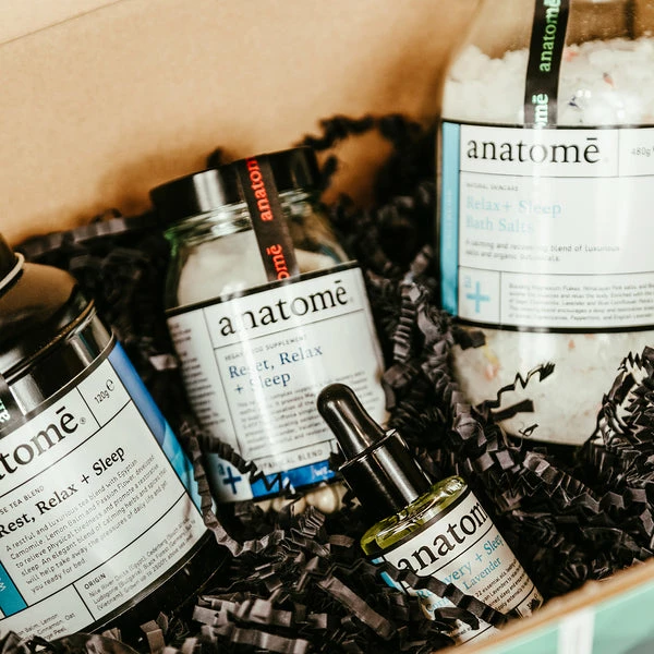 Sleep better with the Sleep box.The ultimate nighttime ritual to help you wind down before bed.This ultimate Sleep box contains four products formulated to give you the best night’s sleep: • Rest, Relax + Sleep supplements: a unique blend of Magnesium, L-Theanine, and 5-HTP are supercharged by adaptogens and botanicals to support optimal relaxation and sound sleep. • Rest, Relax + Sleep Loose Tea Blend: this lightly fruity blend featuring Egyptian chamomile is the calming companion to your winddown ritual. • Relax + Sleep Bath Salts: featuring luxurious, natural salts and organic botanicals, this bath salts helps calm the mind and relax the body in preparation for sleep. • Signature Lavender – Recovery + Sleep Oil: centred around three types of lavender, this oil promotes relaxation and helps support a deeper, more restorative sleep.