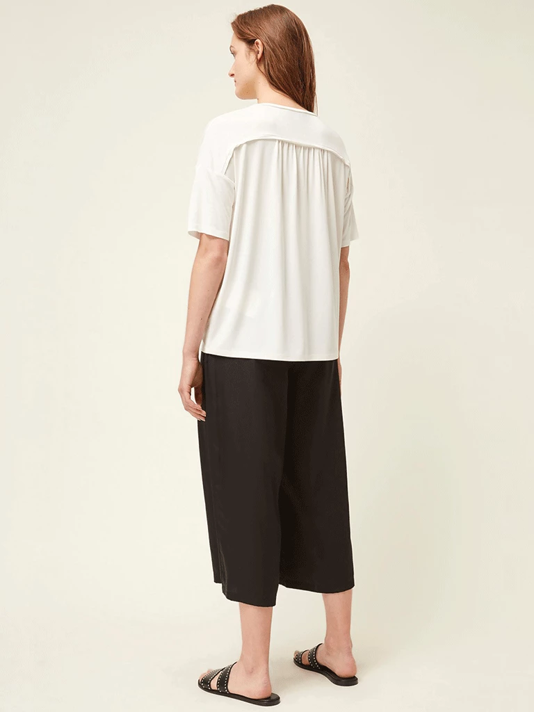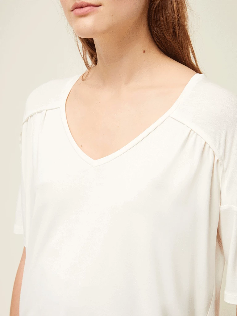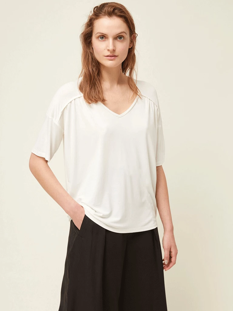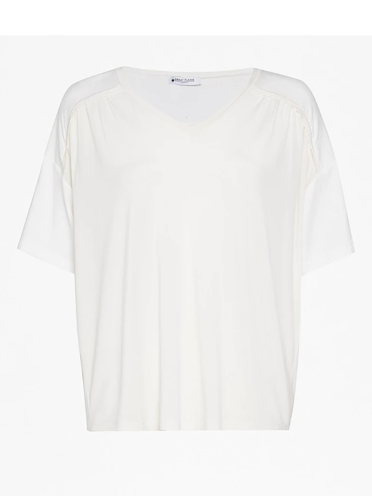 The Leah Jersey T-shirt from Great Plains is a relaxed slouchy V-neck with easy and effortless appeal. It has a wide neckline, short sleeves and a drop shoulder design with subtle ruching on the seam. Slip on over loose trousers and your favourite flats. 70% modal 28% polyester 2% elastane Slouchy T-shirt V-neck Short sleeves Dropped shoulder with ruching Machine wash cold
