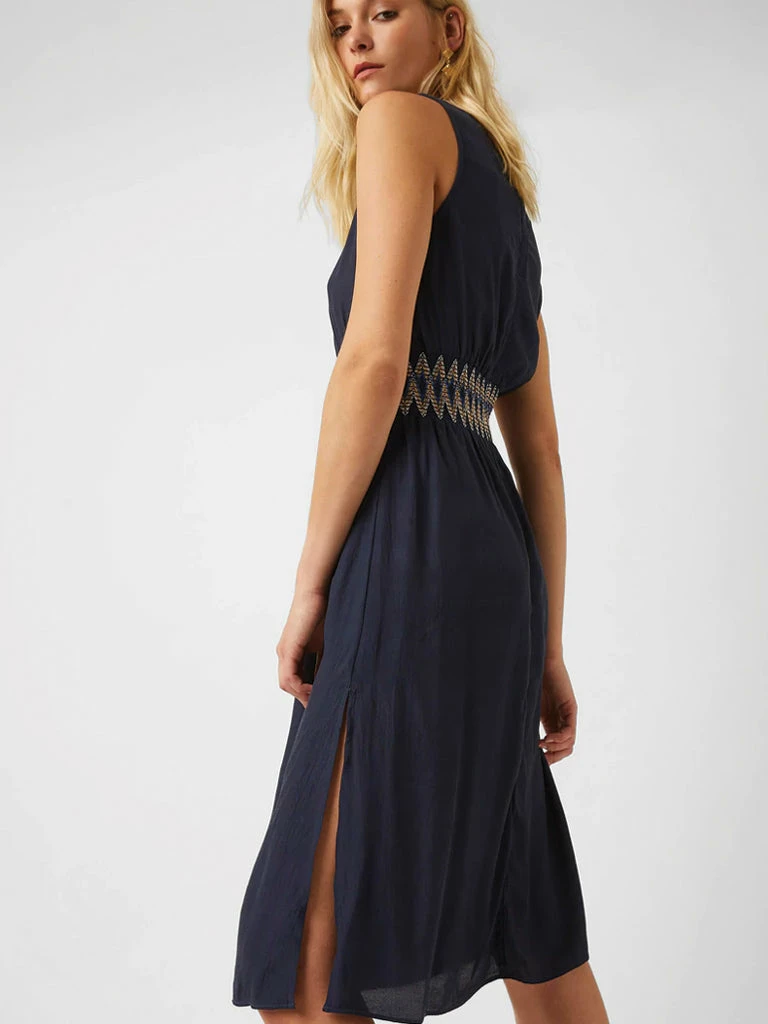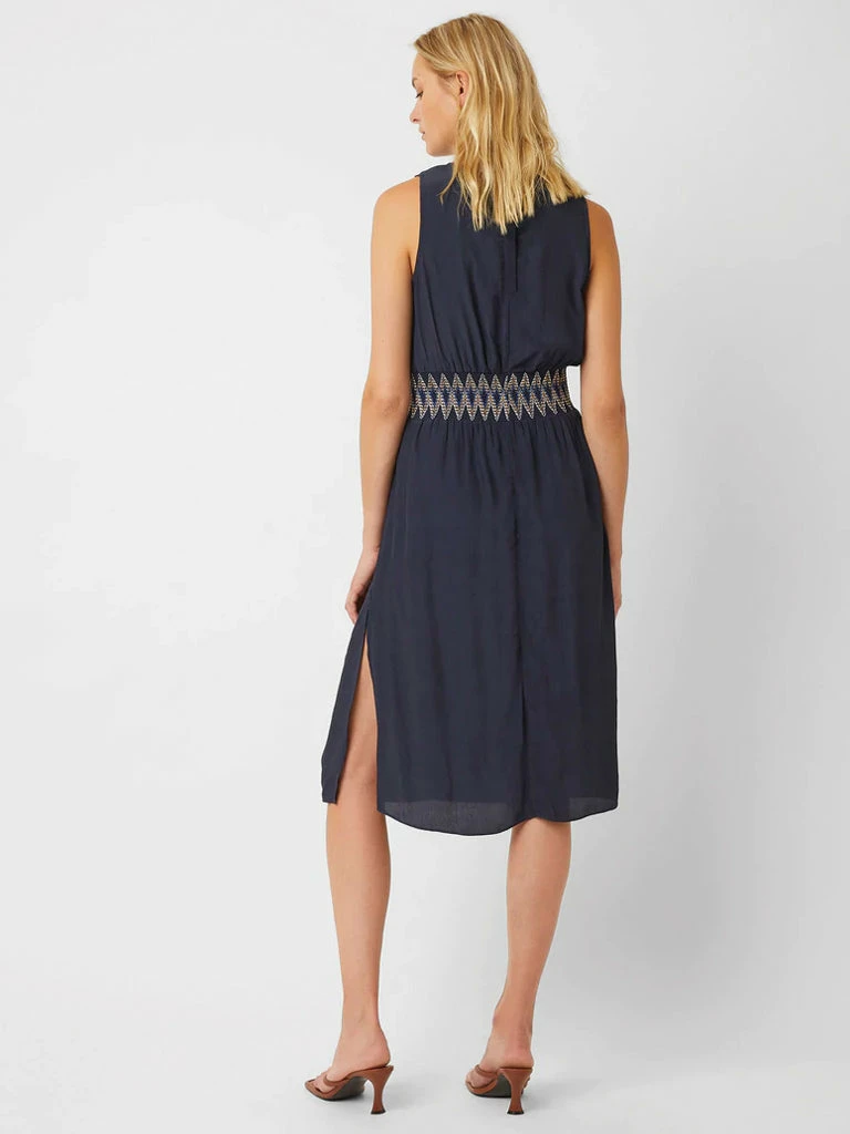 The Samiya Dress from Great Plains features a smocked panel around the waist with a unique embroidered pattern. Crafted from sustainable viscose, this sleeveless dress has a round neckline, back zip fastening, and is finished with side splits. 100% Sustainable Viscose Sleeveless dress with smock detailing Lightweight Round neckline Back zip fastening Machine wash cold Model 5’10” and is wearing a size 8